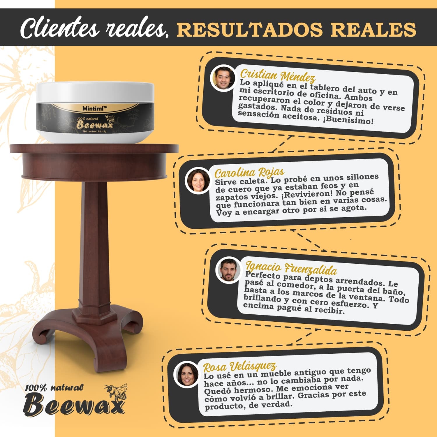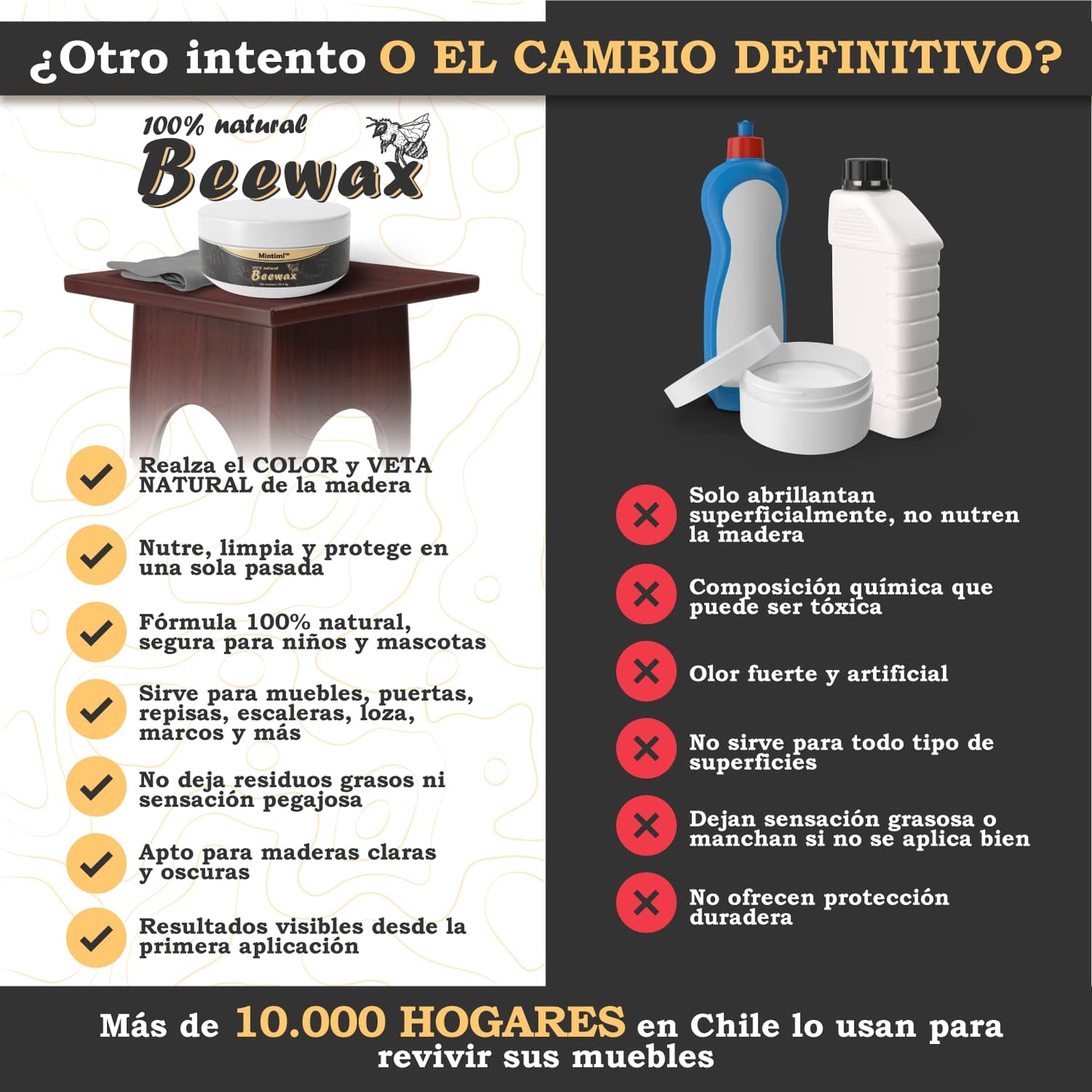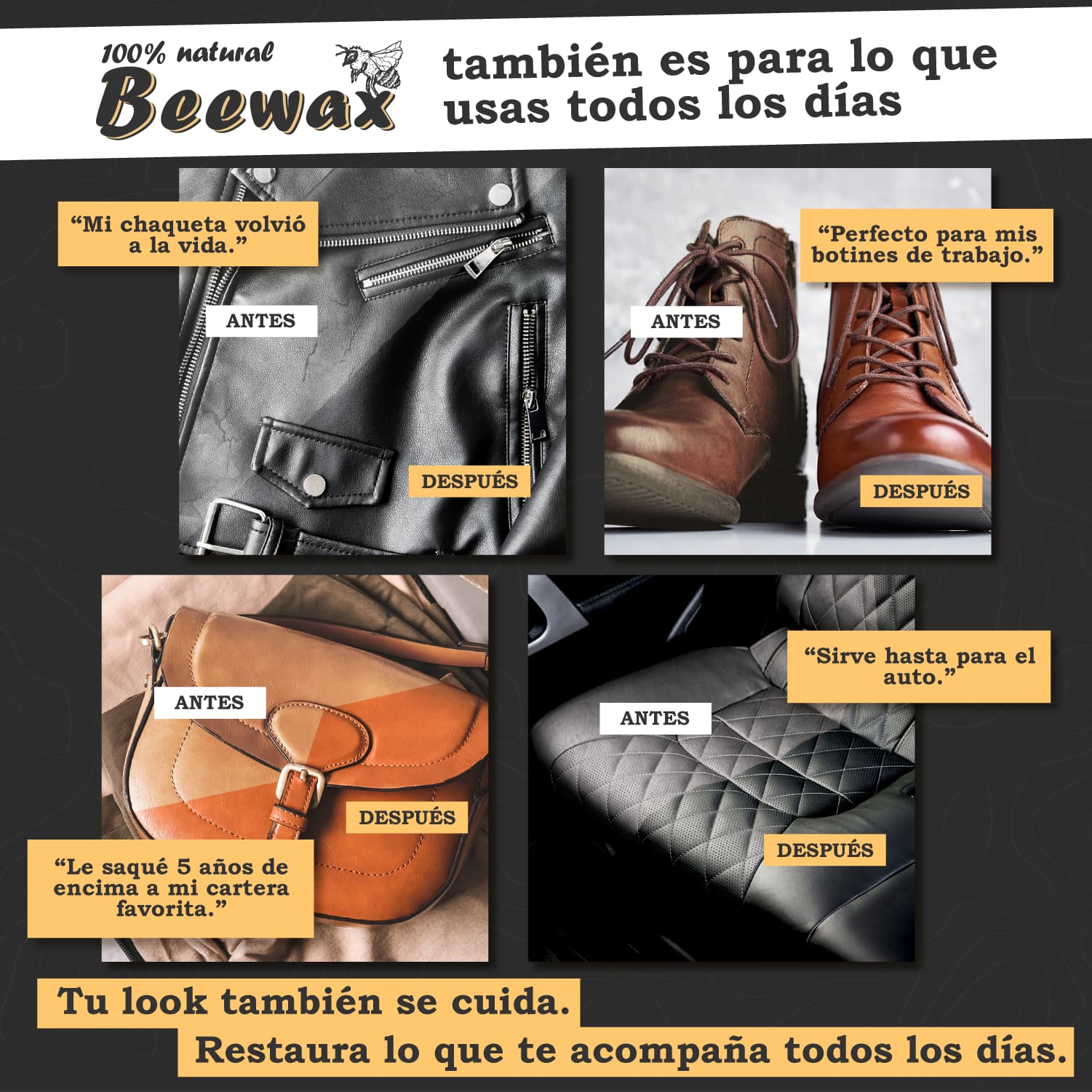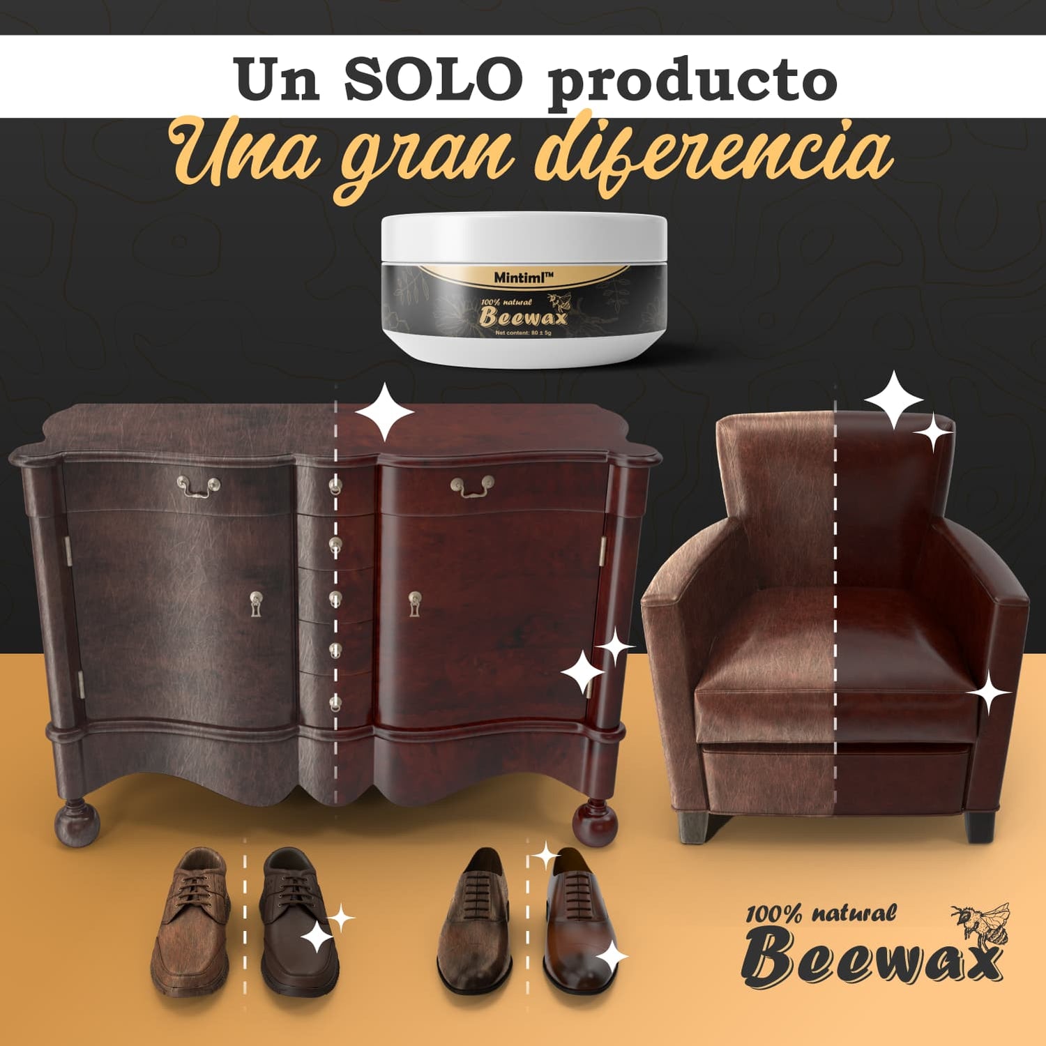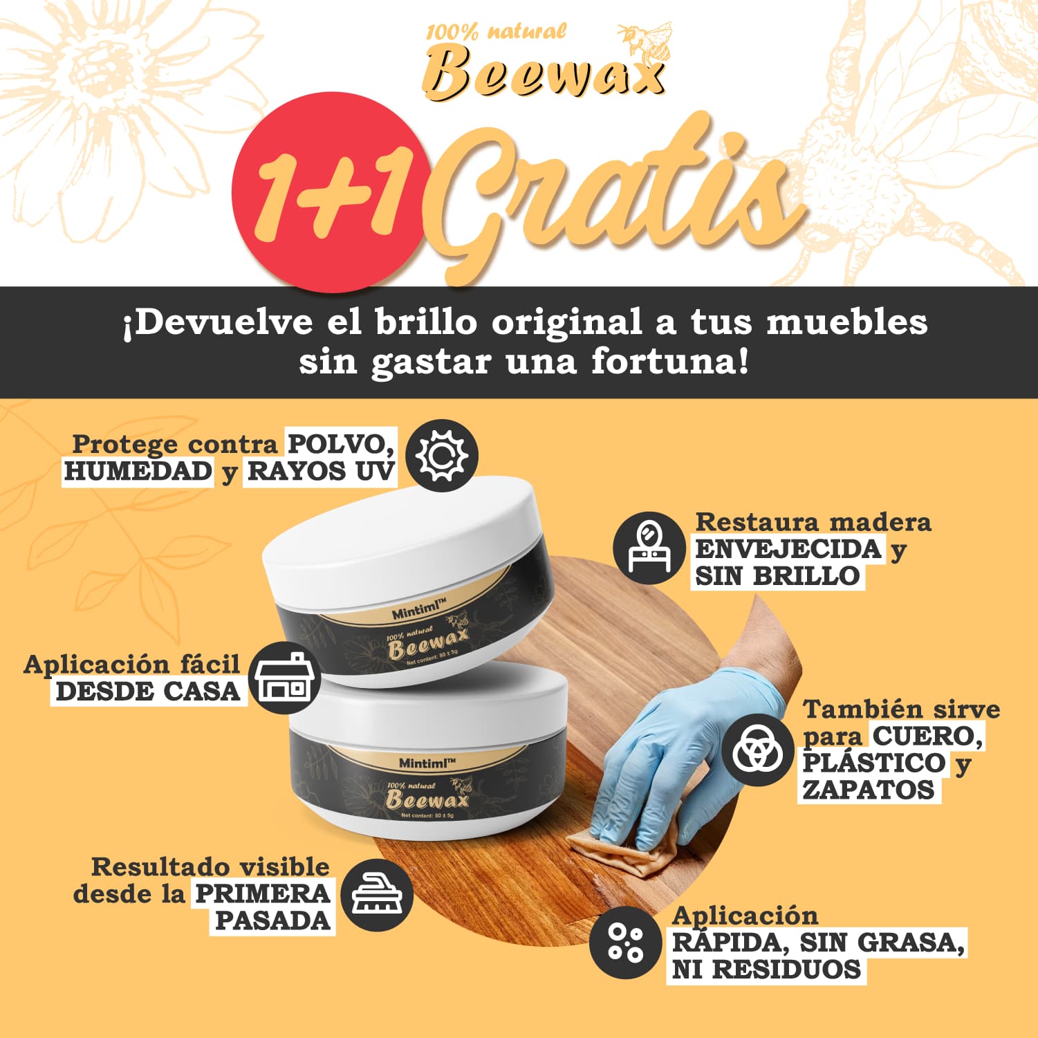 Con Beewax® MAX, no solo devuelves el brillo a tus superficies: eliminas el desgaste invisible que opaca madera, cuero o plástico. Su fórmula premium actúa desde la raíz, nutriendo, protegiendo y restaurando, mientras previene humedad, polvo y rayos UV, para que disfrutes muebles y objetos que lucen como nuevos, con color, vida y protección duradera