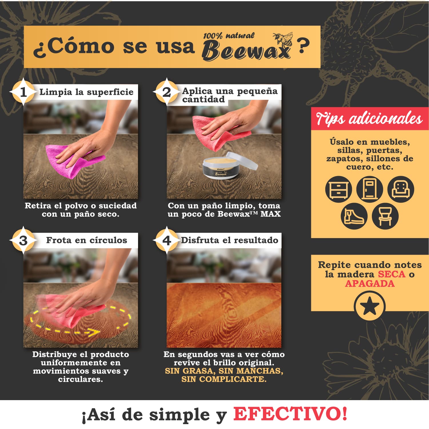 Con Beewax®MAX, restauras, proteges y devuelves el brillo original a madera, cuero, plástico y más en segundos