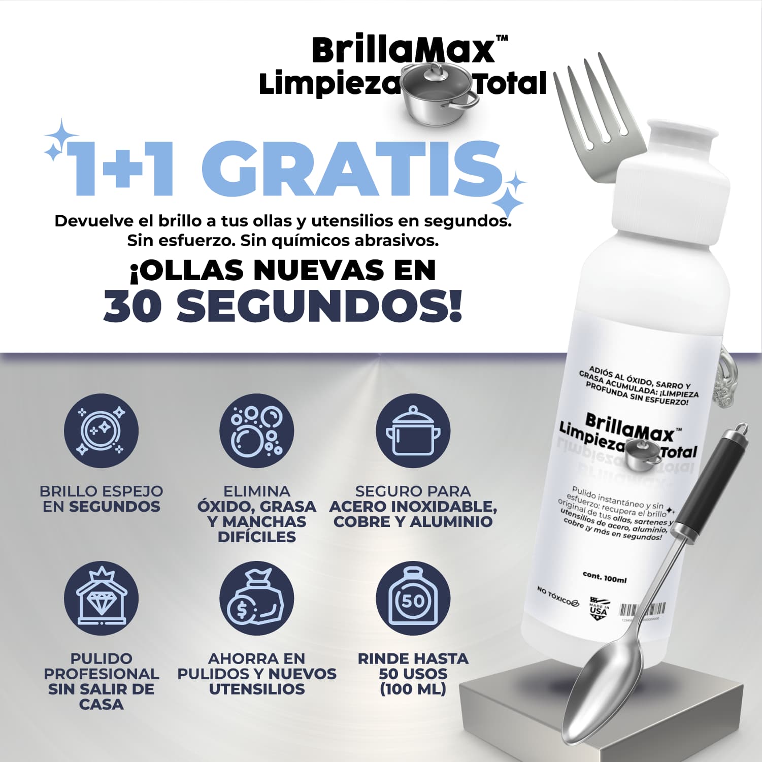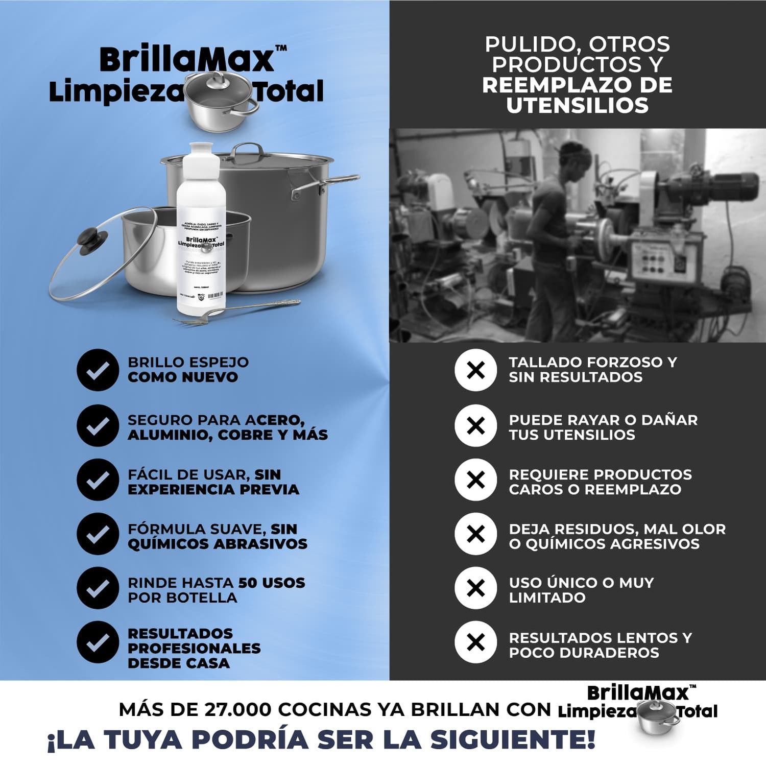 BrillaMax® ha sido formulado específicamente para funcionar de manera segura y efectiva sobre superficies metálicas como acero inoxidable, cobre y aluminio.