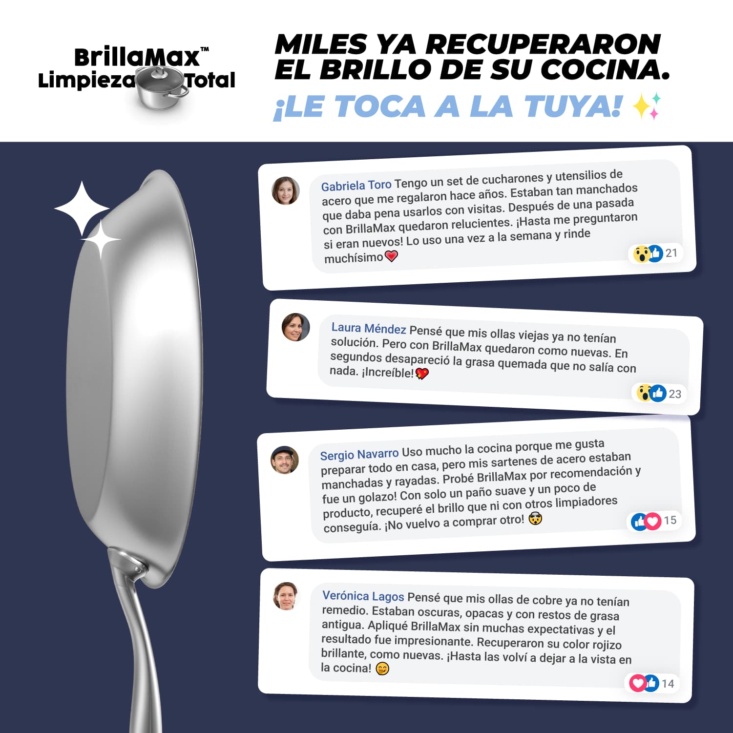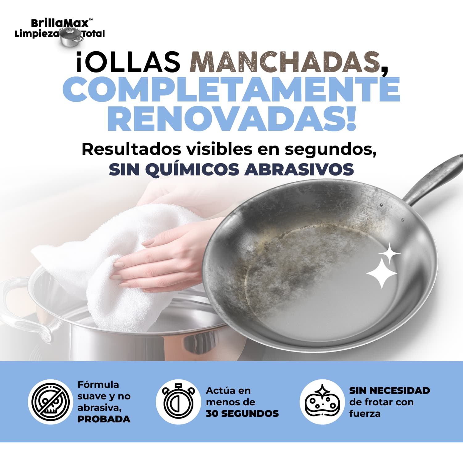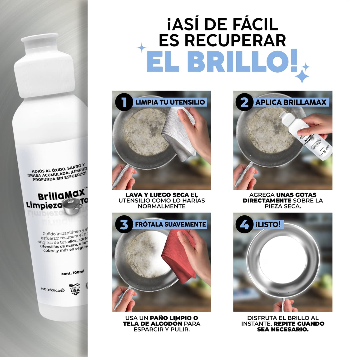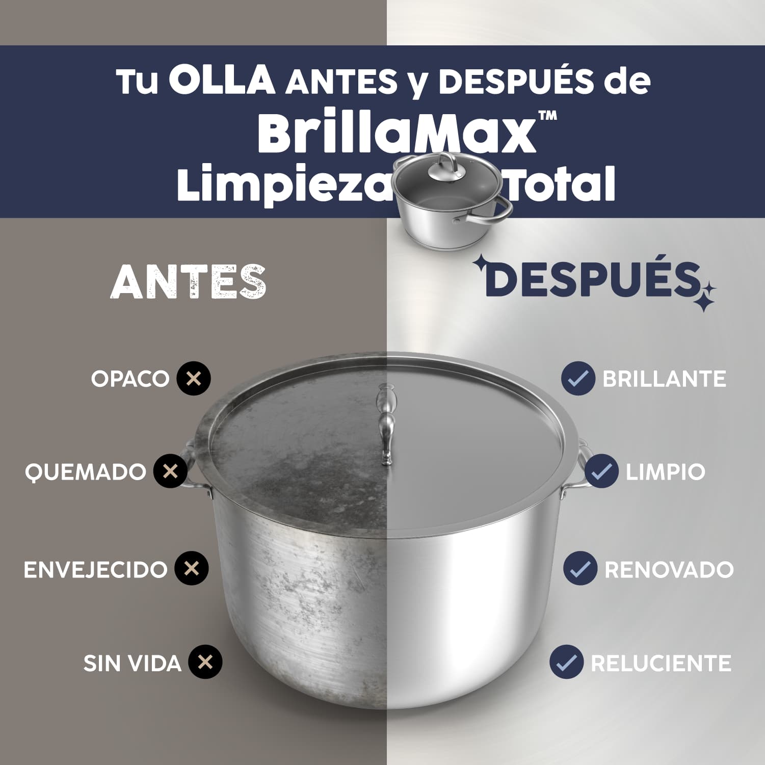 Con BrillaMax®, no solo limpiás manchas: eliminas el óxido, sarro y grasa acumulada que deterioran tus utensilios.