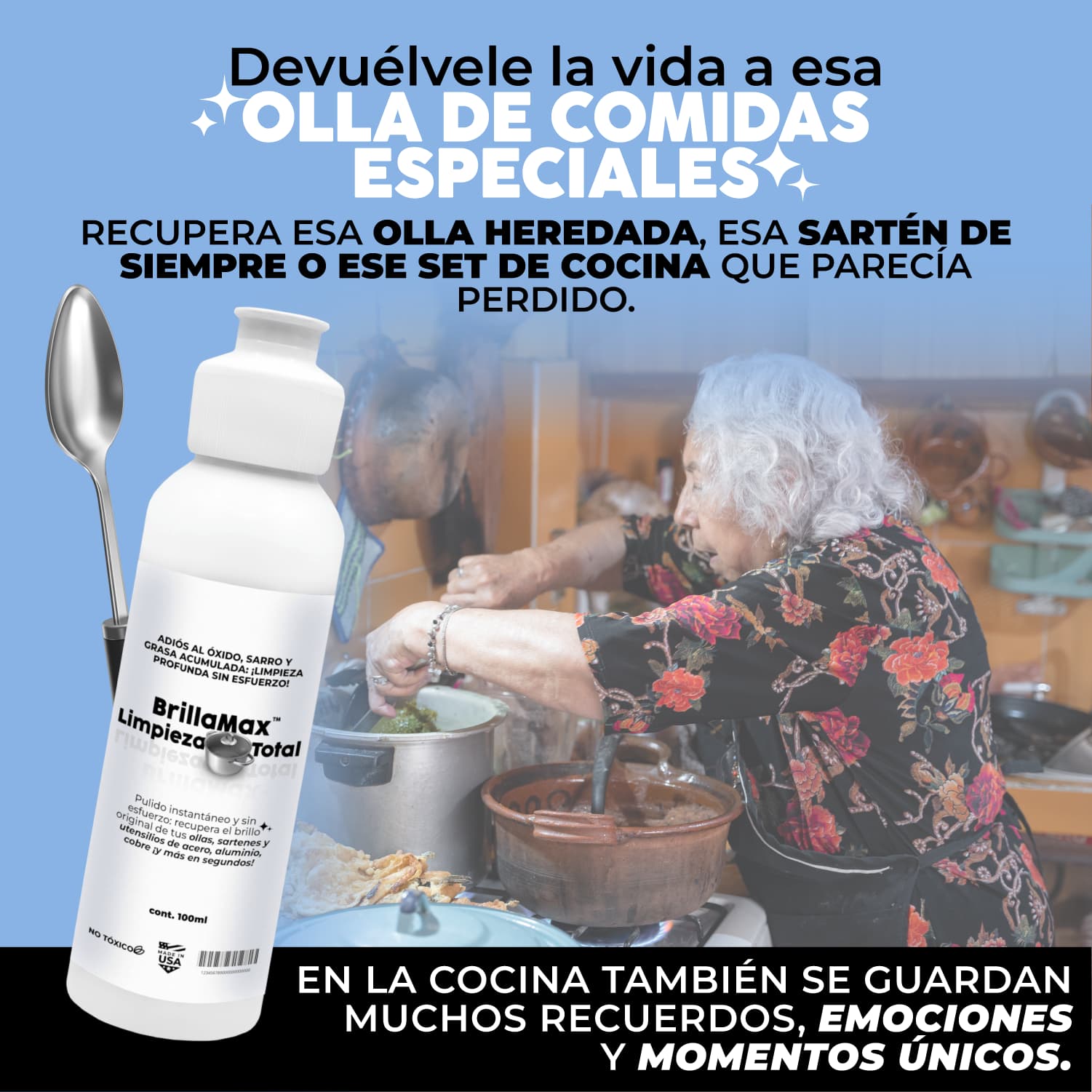 Estos compuestos disuelven la suciedad más difícil, rompen la adhesión del óxido al metal y restauran el brillo original de tus ollas y utensilios desde la primera aplicación.