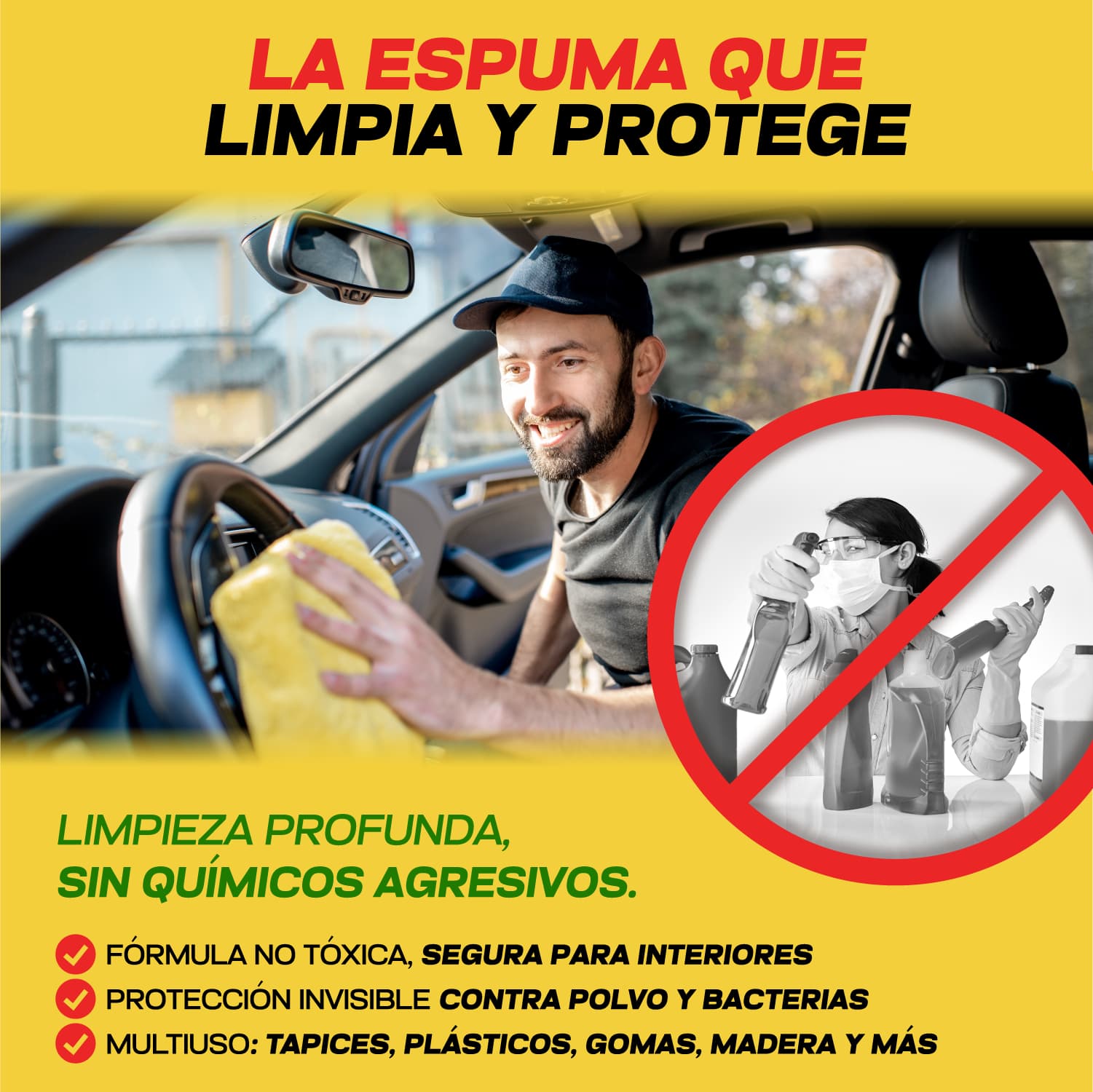 FoamCleaner® proporciona una protección duradera que puede durar hasta 3 meses. Su fórmula crea una capa protectora que repela el polvo y la suciedad, evitando que se adhieran a las superficies. Además, previene manchas y ayuda a mantener el acabado limpio y brillante por más tiempo, sin necesidad de reaplicar el producto constantemente.