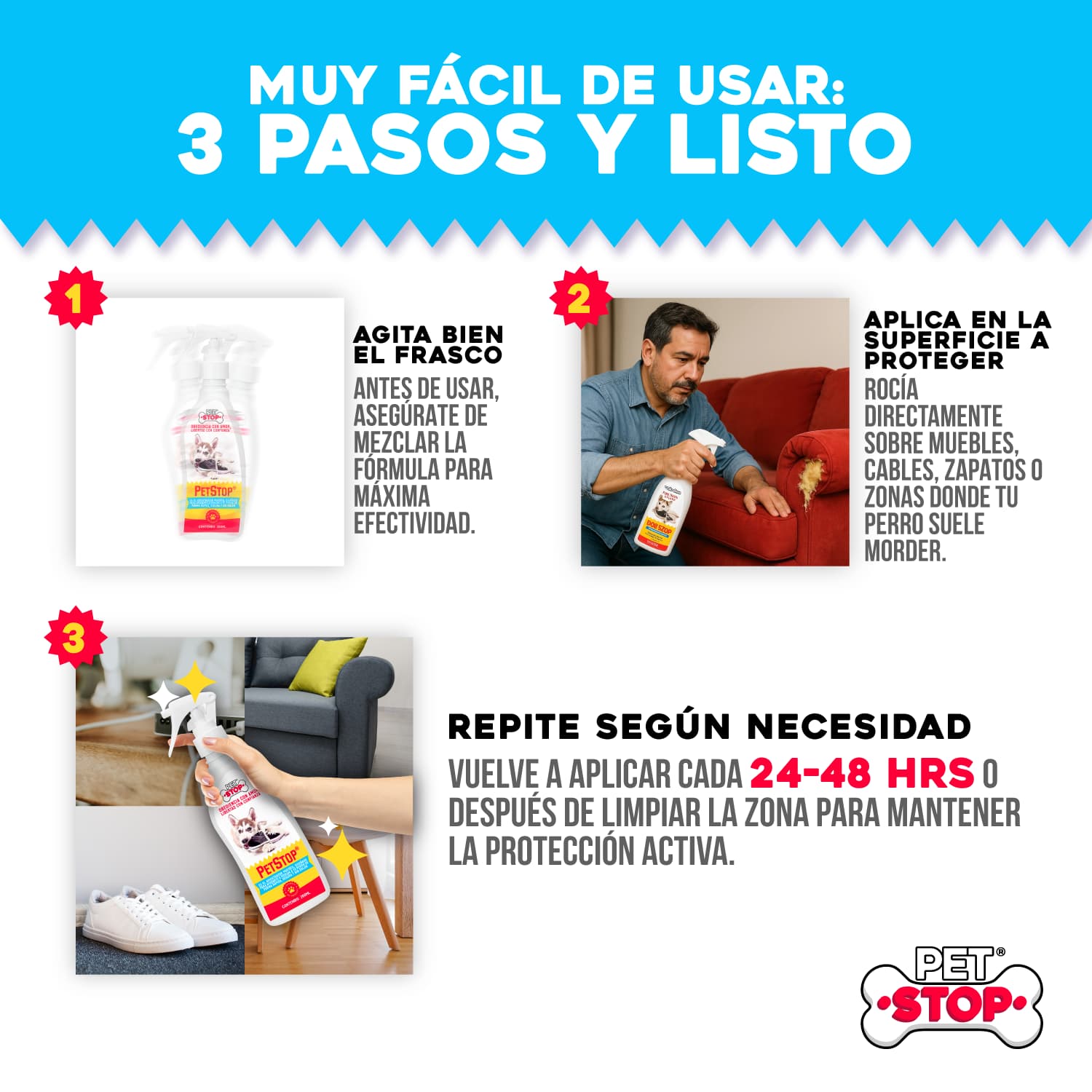 Enfócate en las áreas donde más necesita protección: sofás, zapatos, cables y otros objetos peligrosos. Gracias a su fórmula segura y natural, PetStop® educa a tu perro de manera rápida, evitando destrozos y riesgos, sin causar daños ni irritaciones.