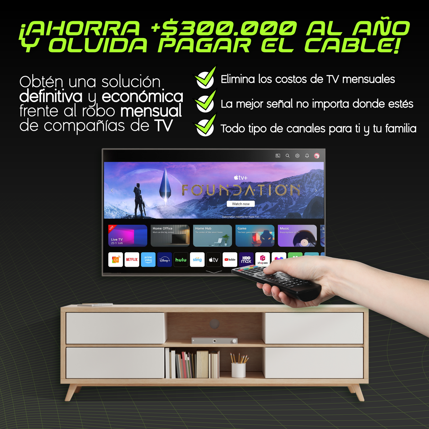 Acceso gratuito a +1.000 canales de cable, sin pagos mensuales, sin instalaciones complicadas y con señal ultra estable.