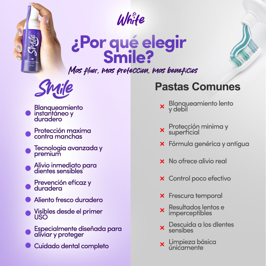 Mientras otras pastas solo limpian, Smile® blanquea, protege y fortalece tus dientes al instante. Su fórmula única previene caries, cuida el esmalte y te da una sonrisa radiante desde el primer uso.