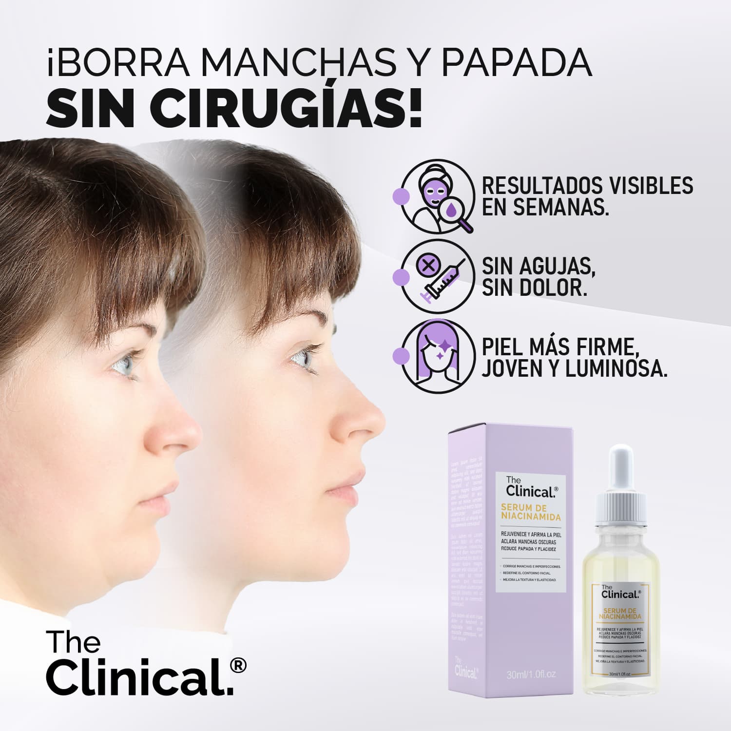 La flacidez afecta tu rostro. Con TheClinical®, redefine y reafirma tu rostro al instante.